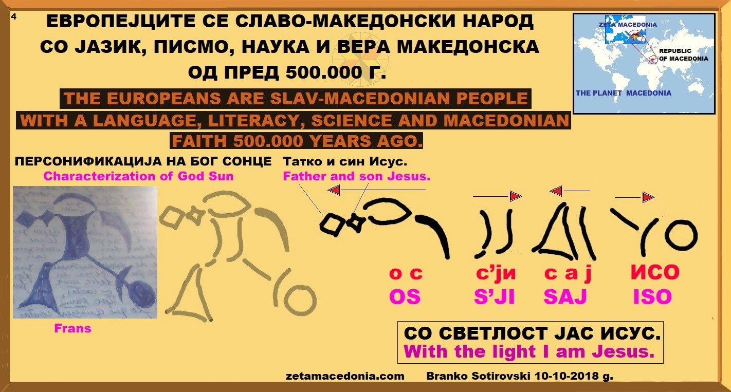 26.01.2018   На пронајдениот камен во Зета Македонија Пиринејска, во областа СЕКОЈ ЛОМ, односно во територијата на денешна Каталонија, стои натпис на кој пишува: „ЛУНА ИС 22-РИ С ИЛИ Ј'ЛТ ЅИ“. Транскрибирано на современ македонски јазик би значело: „ЛУНА ИС - ИСУС ОД 22-РИ ДЕКЕМВРИ СО ИЛИ, ЈАС ВО ЛЕТ ГЛЕДАМ“.